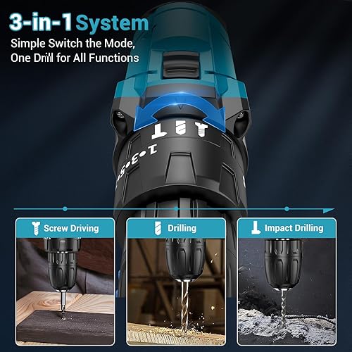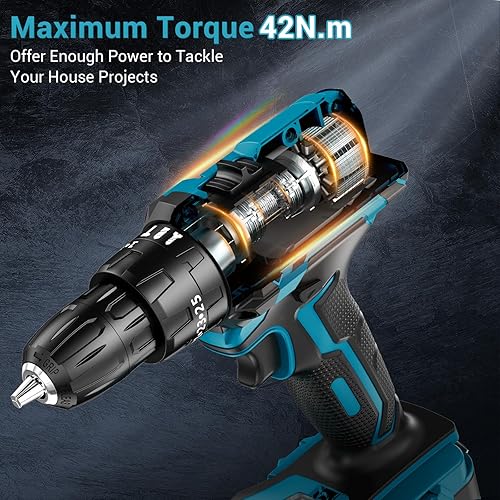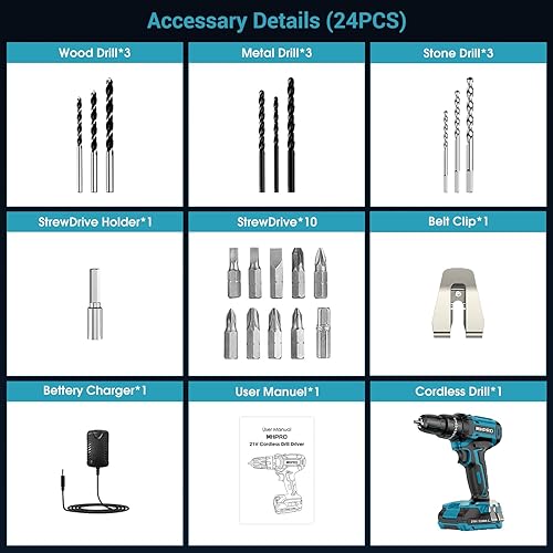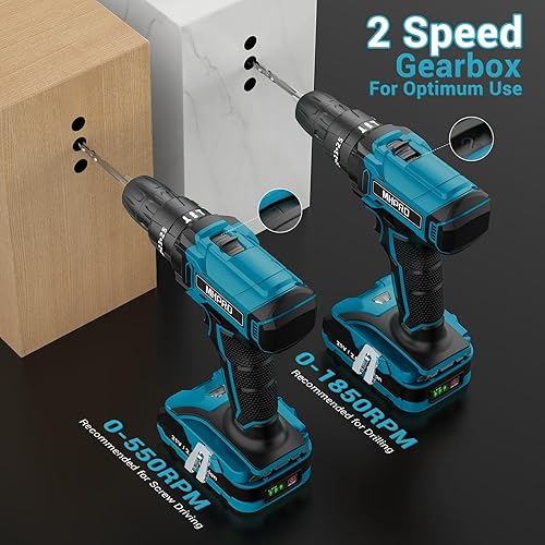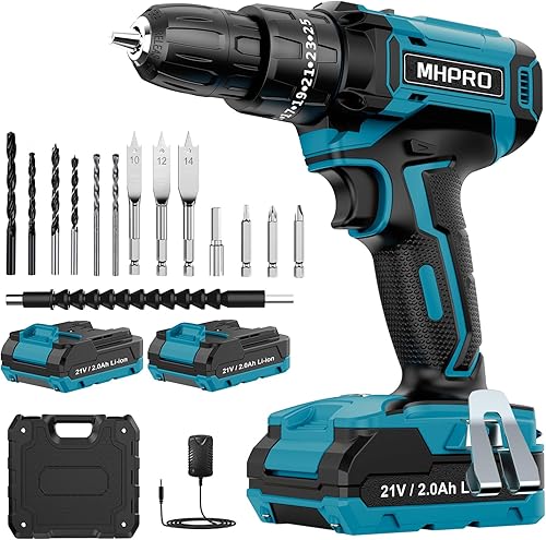 MHPRO Akkuschrauber 21V, Akku Bohrschrauber mit 2 Akkus 2.0Ah, 42Nm Akku Bohrmaschine, 2 Gang, 25+3 Drehmomentstufen, 10mm Bohrfutter, LED Licht, 14tlg Zubehöre Set für Haus und Garten DIY Projekt