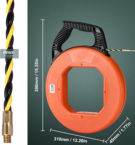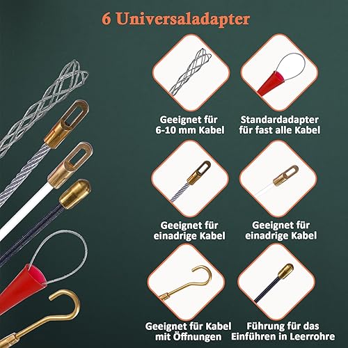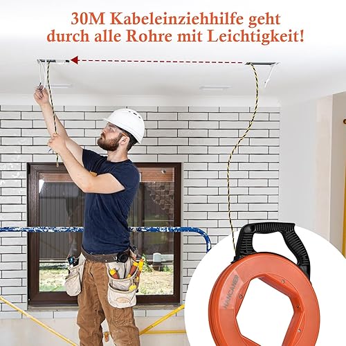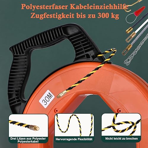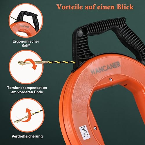 Hancaner Kabeleinziehhilfe 30M für Leerrohre inkl. 6 Adapter Einzugshilfe Kabel Einziehspirale - Zugdraht für Leerrohre mit Bruchsicherem Kabel, Kabeleinziehgerät mit Kunststoffgehäuse und Handgriff