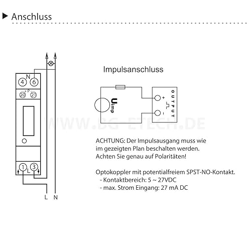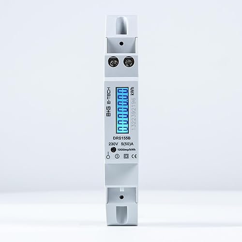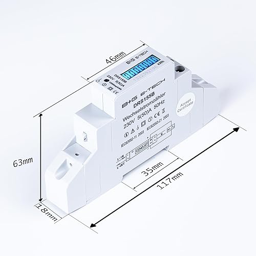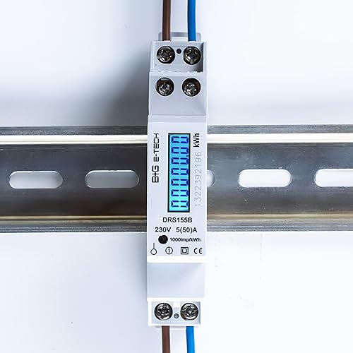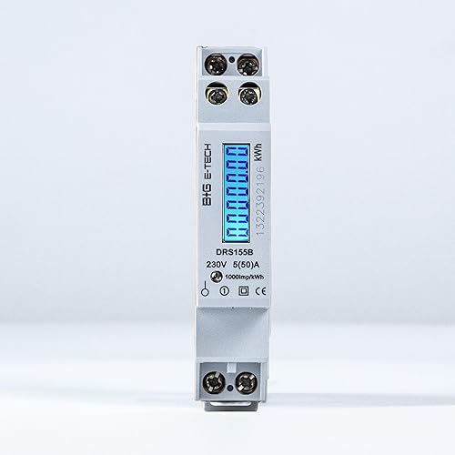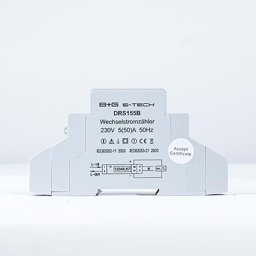 B+G E-Tech [DRS155] - LCD Digitaler Wechselstromzähler für Hutschiene, 1-Phasen Stromzähler Wattmeter mit Leistungsanzeige, S0, 1 TE, 230V 50A (DRS155B)