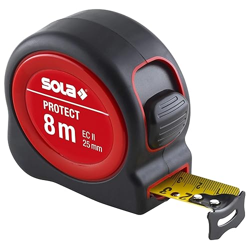 SOLA PROTECT - Bandmaß 8m / 25mm - robustes Rollbandmaß mit Gürtelclip - Stahlband, gelb lackiert mit mm Skala - Genauigkeitsklasse II - Rollmeter mit beweglichem Endhaken - Länge 3m, 5m, 8m