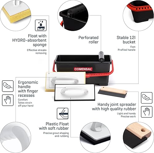 COMENSAL Fliesenwaschset - 7-teiliges Fliesenleger Waschset M - 12L - Profi Fliesen Waschset zum Verputzen - mit Rollenaufsatz - Fugengummi - Hydroschwamm - Reibebrett mit Zellkautschuk - Made in EU