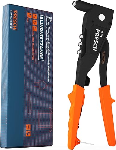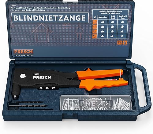 Presch Blindnietzange Set 79tlg. im Koffer - Inkl. 75 Blindnieten, passenden HSS Bohrern und Montageschlüssel mit Nietlehre - All in One Nietzange Set - Blindnietzange Profi