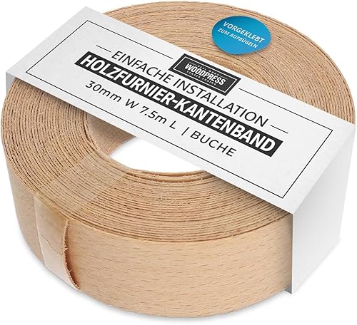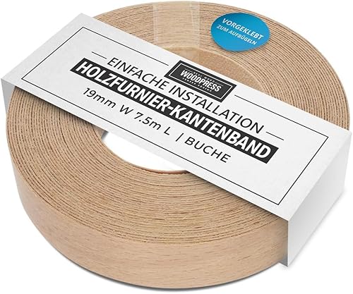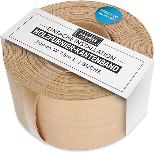 WoodPress® 15 mm echte gedämpfte Buchenkante zum Aufbügeln – 7,5 m Rolle – vorgeklebtes Holzfurnierband für einfache DIY-Anwendung