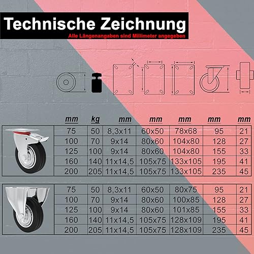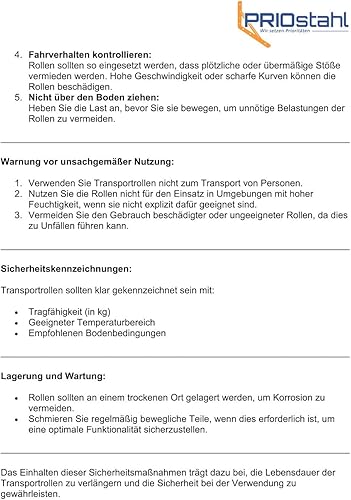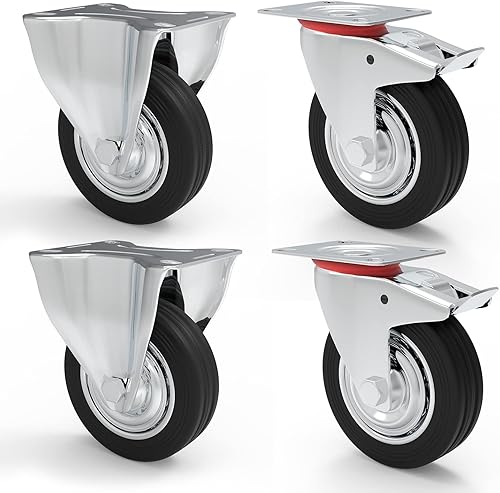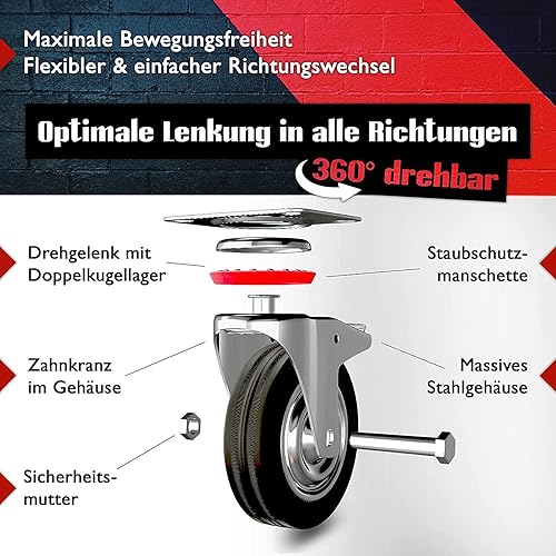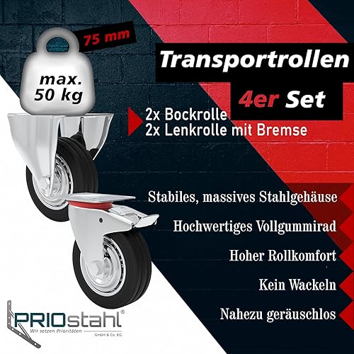 PRIOstahl TR-Set-3 Transportrollen Schwerlastrollen Set 2X Bockrollen & 2X Lenkrolle mit Bremse | 125mm Durchmesser | Gummi Schwarz | Vollgummi mit Stahlfelge