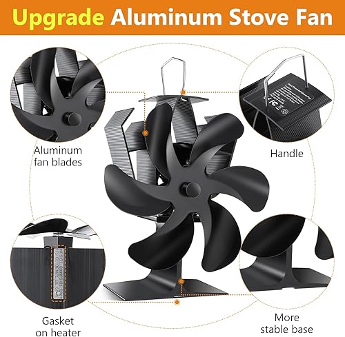 Xmasneed Kaminventilator, 6 Flügel-Ofenventilator Ohne Strom Leiser Betrieb, Wärmebetriebener Ventilator mit Thermometer, Hitzebetrieben Kamin Ventilator Ohne Strom für Holz/Holzbrenner/Kamin