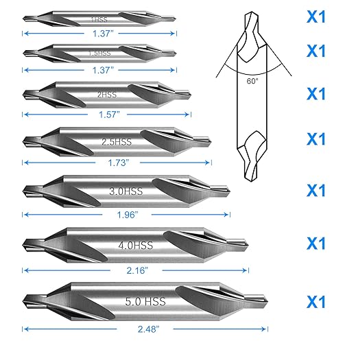 7-teiliges Zentrierbohrer-Set, M2 Hochgeschwindigkeitsstahl, 60-Grad-Winkel, Zentrierbohrer, Kegelsenker-Werkzeuge für Drehmaschine, Metallbearbeitung, Größe 1,0, 1,5, 2,0, 2,5, 3,0, 4,0, 5,0