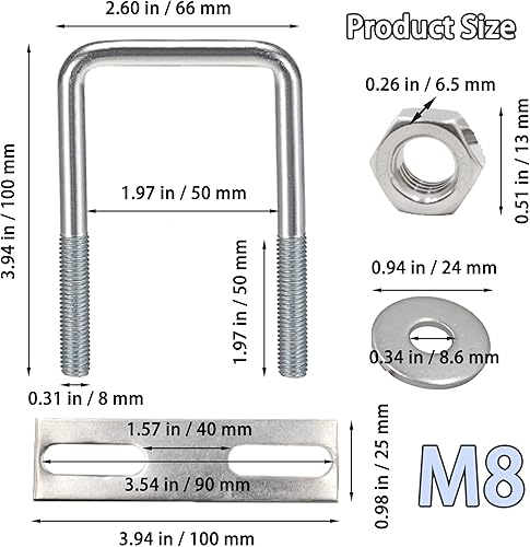 duoyif U Bolzen Bügelschraube 100 x 50mm Quadratische Bolzen U, M8 Bolzen Edelstahl Mit Mutter Rahmen Und Unterlegscheibe, U-Bügel Für Abschleppen Von Autos, Schiffen Reparatur Von Pipelines 2Stücke