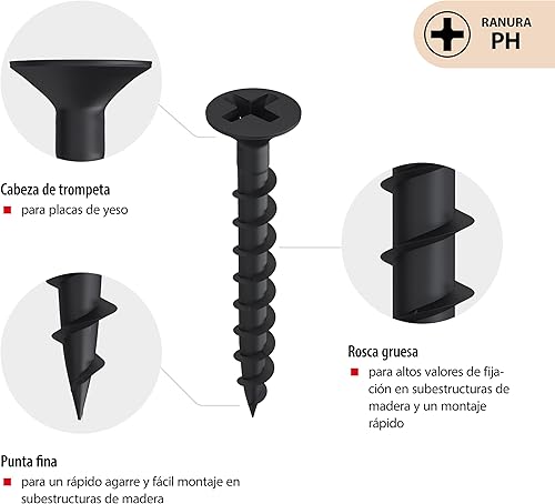 TOX Schnellbauschrauben DRY GG 3,9 x 35 mm, Schrauben schwarz phosphatiert mit Trompetenkopf + Grobgewinde, Gipskartonplatte auf Holz-Unterkonstruktion, PH2, 1000 Stück, inkl. 1x Bit, 142353213935