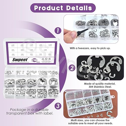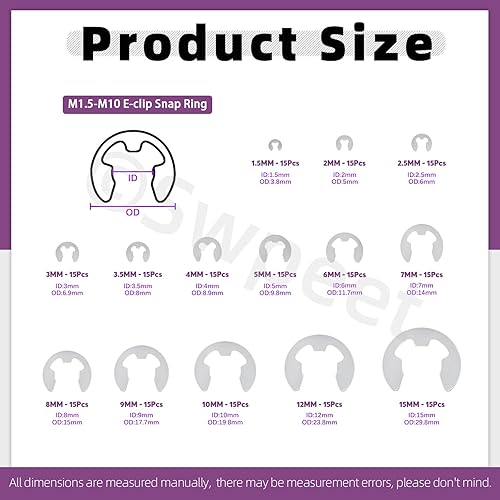 Swpeet Innenzahn-Sternsicherungsscheiben (Manganstahl E-Clips), M1.5 M2 M2.5 M3 M3.5 M4 M5 M6 M7 M8 M9 M10 M12 M15 Externe Sicherungsringe Sprengring E-Ring