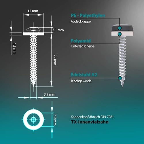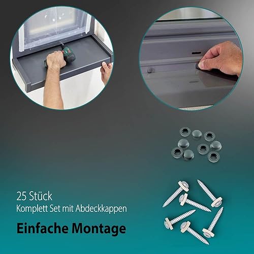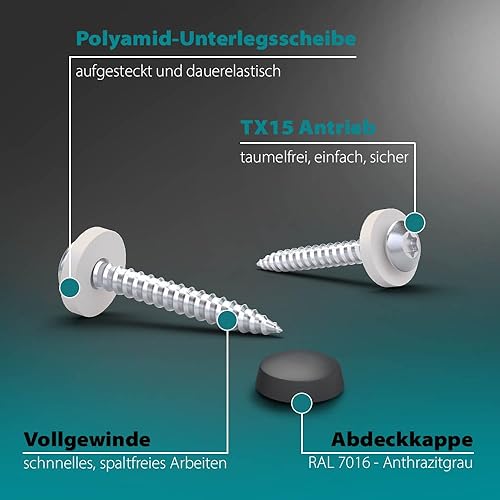 VOOXA Premium Fensterbankschrauben 3,9 x 22mm TX15 Edelstahl A2 mit Polyamidscheibe und Abdeckkappen Anthrazit RAL7016, für Alu und Kunststoff Fensterrahmen, 50 Stück