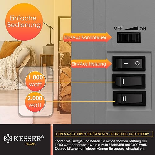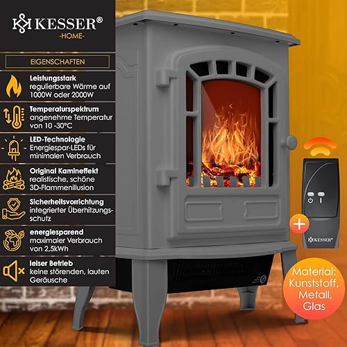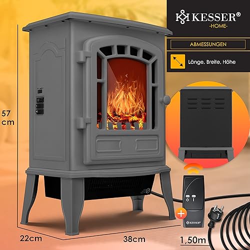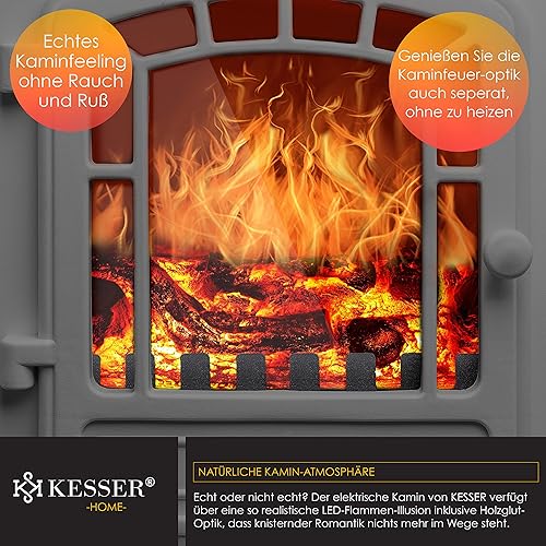 KESSER® Elektrokamin mit Heizlüfter & Fernbedienung 2000W Elektro Kamin Elektrischer Heizung LED Kaminfeuer Effekt Kaminofen Flammeneffekt Heizer Ofen geräuscharm regelbar Schwarz