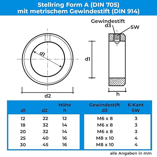 Stahlia Stellring 30mm 4 Stück Sicherungsring Edelstahl V2A rostfrei Stellringe mit Gewindestift Form A Wellenringe nach DIN 705 für Welle, Achse und Schubkarrenrad