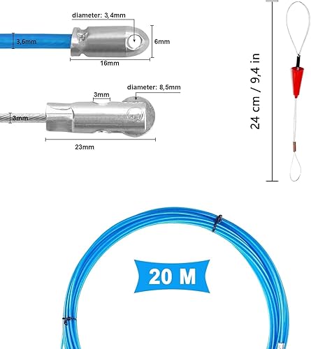 Kabeleinziehhilfe 20 m, φ 3,6 mm Polyester Einziehdraht, Polyesterseil mit 2 Führungsfedern, Für Kabel, Glasfaser, Telekommunikation, Haushaltsstrom, Baustellen