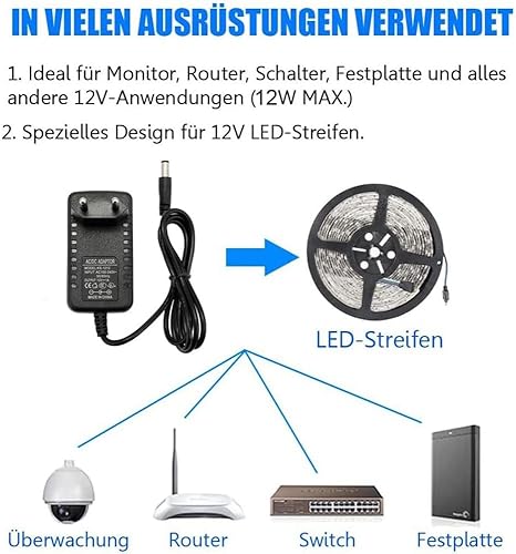 GreenSun LED Netzteil Netzadapter DC 12V, AC 100-240V Trafo für 3528/5050 LED Streifen 12W Maximal Stromversorgung 1A EU Stecker