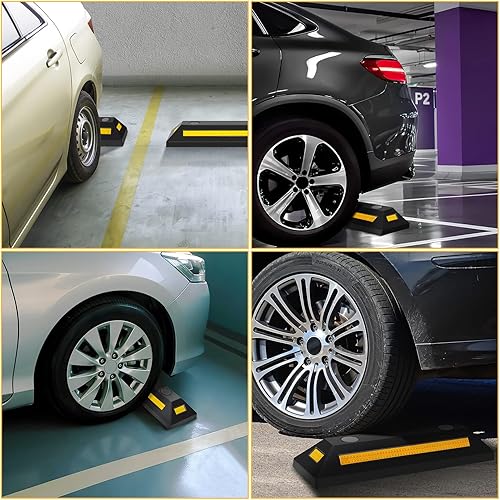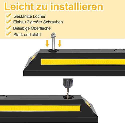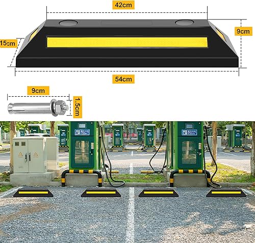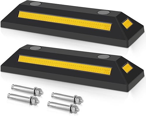 Fiqops 2 x Gummi Radstopper mit Gelb Reflektierende Streifen, 54x15x10cm Parkplatzbegrenzung, Parkplatzsperre, Parkstopper mit Dehnschraube, Parkplatzsperren für Parkplätze Garage Parkhäuser