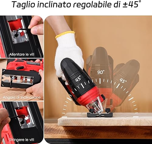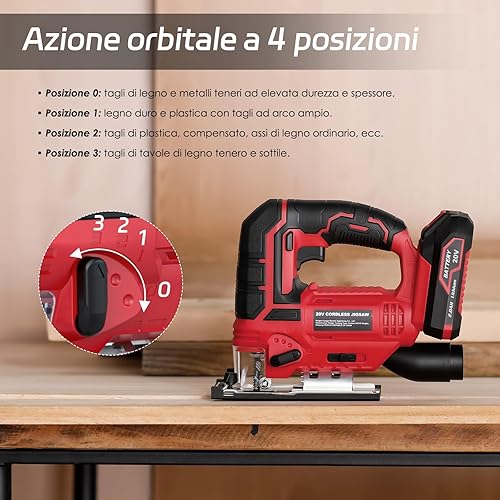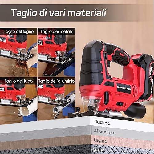 Stichsäge - 20V Akku Stichsäge für die Holzbearbeitung -45 °bis 45° Fasenschneiden mit 4 Orbitaleinstellungen, 2700 SPM Stichsäge mit LED-Licht, 10-Sägeblattsatz, 2,0Ah-Akku, 1 Schnellladegerät (Rot)