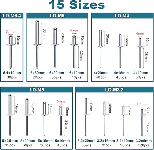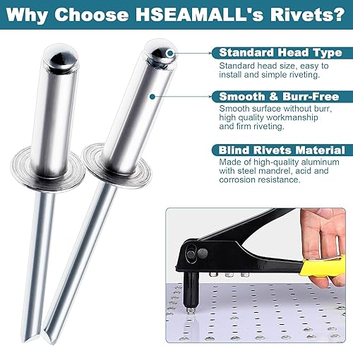 HSEAMALL 740 Stück Blindnieten, 6,4 mm/6 mm/5 mm/4 mm/3,2 mm, Aluminium-Blindnieten, Kuppelkopfnieten, offenes Ende, Popnieten, Kernziehnieten