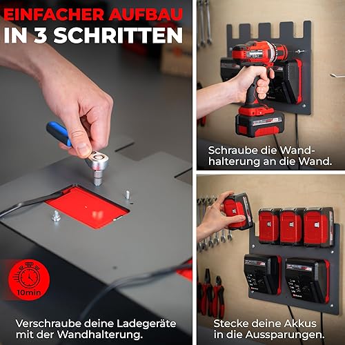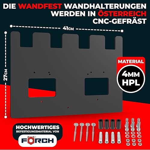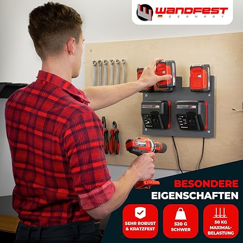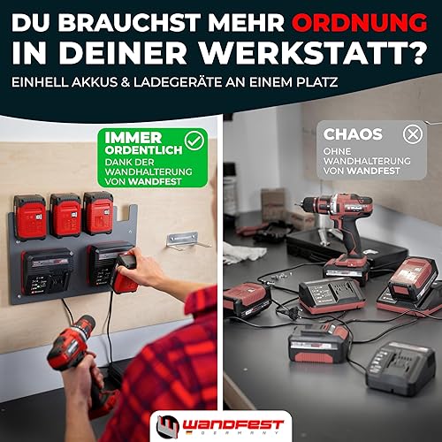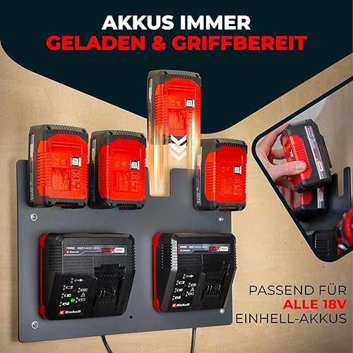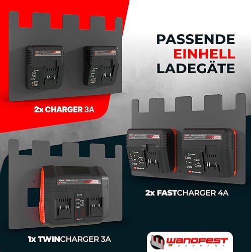 Wandfest Wandhalterung für Einhell Akkus und Ladegeräte - Das Original | Glänzende & Matte Seite [Made IN Austria] | Stabile Einhell Akku Halterung | 1-4 Akkus