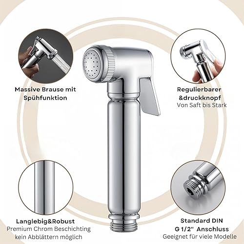 Soho Design WC/Bidet Handbrause Komplettset Chrom, Massiv Taharat, Messing Bidet Handbrause für Bidet Armaturen WC, Handbrause Bad Bidet mit G1/2' Ventil, 120 cm flexiblem Schlauch, ideal für WC/Bidet