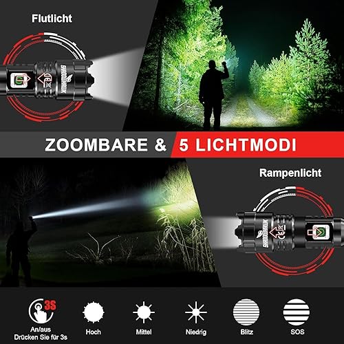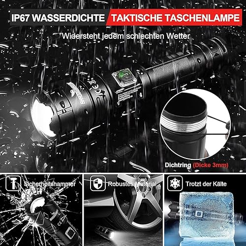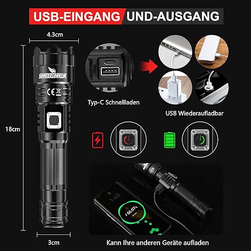 Shadowhawk LED Taschenlampe Aufladbar, Extrem Hell 500000 Lumen Taschenlampen Batteriebetrieben USB, XHP70.2 Taktische Taschenlampe, IP67 Wasserdicht 5 Lichtmodi Zoombar für Camping Wandern Notfälle