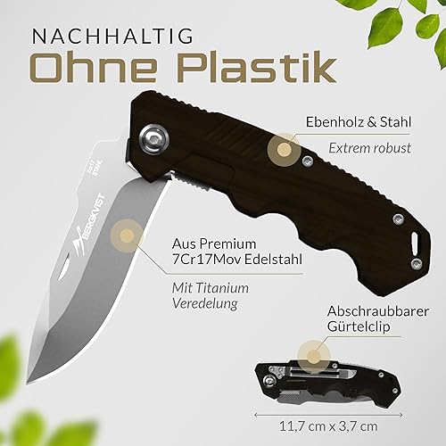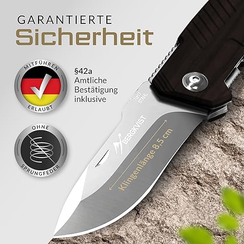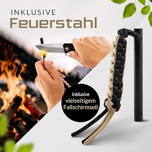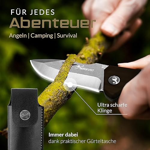 BERGKVIST® K10 Klappmesser (Zweihandmesser) - scharfes Taschenmesser für Outdoor & Survival mit Feuerstahl & Tasche - Mitführen in Deutschland erlaubt - Vollmetall