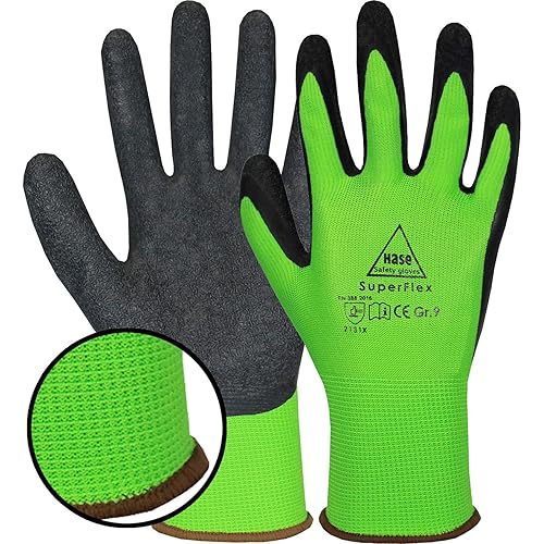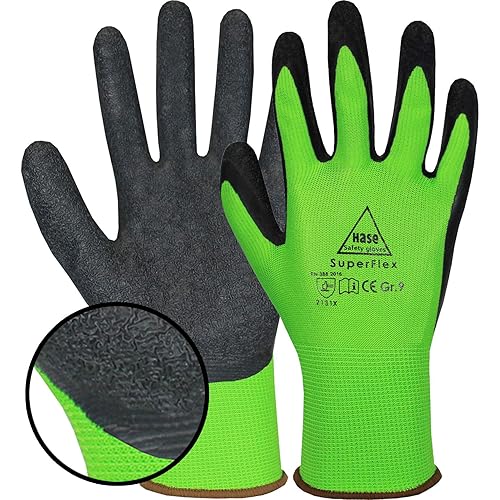 10 Paar Hase Superflex Arbeitshandschuhe mit Latexbeschichtung, Rutschfeste Gartenhandschuhe, Angenehmer, Ideal für Handwerk, Gartenarbeiten, Industrie Grün Gr. L (09)