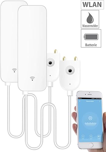 Luminea Home Control Wasserwarner: 2er-Set WLAN-Wassermelder, externer Sensor, App, 2 J. Batterielaufzeit (Elesion Wassermelder, Wasserwarnmelder, iPhone wasserdicht)