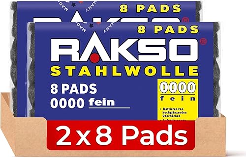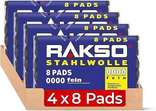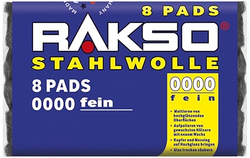 RAKSO Stahlwolle extrafein 0000-8 Pads, poliert gewachstes Holz, Kupfer, Messing, mattiert Oberflächen, säubert Glas