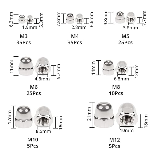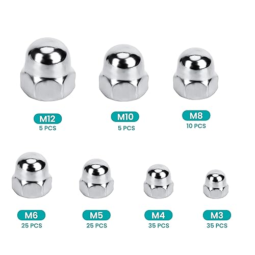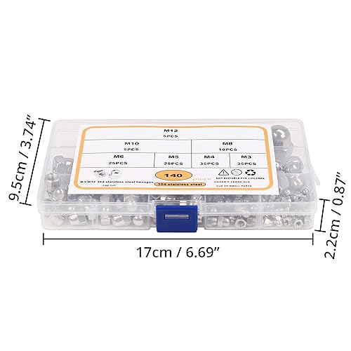 Belle Vous Eichelmuttern Sechskant-Hutmuttern Edelstahl (140 Stk) - M3, M4, M5, M6, M8, M10 & Hutmuttern M12 Edelstahl Set - Fahrrad Hutmutter mit Aufbewahrungskoffer für Innen- & Außenbereich
