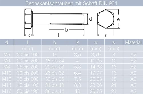 Sechskantschrauben mit Schaft M10x180 mm & Edelstahlmuttern M10 aus Edelstahl A2 (5 Stück) | DIN 931 & DIN 934 - Maschinenschrauben - Sechskantmuttern von MESAROS®