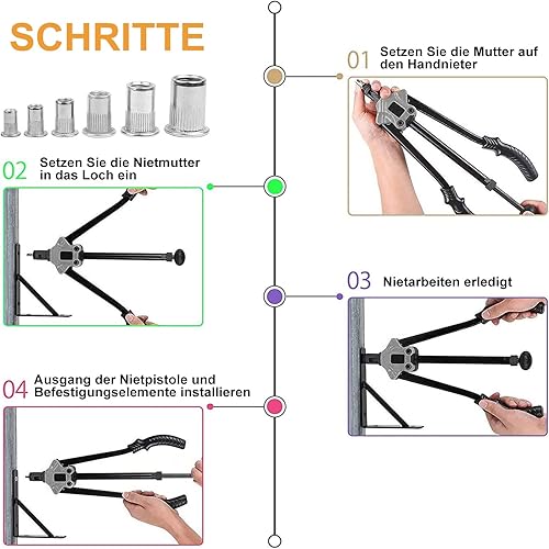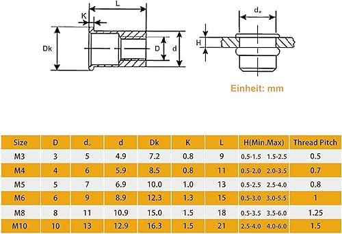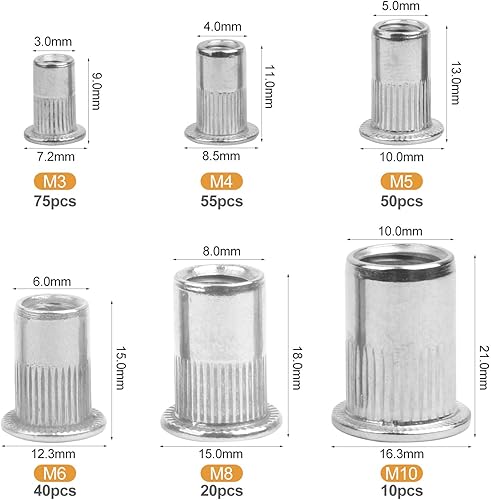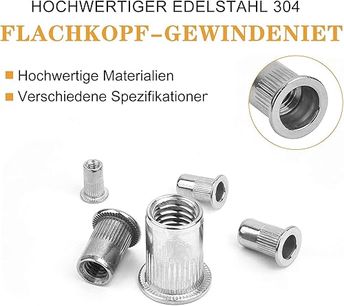 VIGRUE 250Stk Nietmuttern Sortiment M3 M4 M5 M6 M8 M10 Gewindenieten Nietmutter A2-70 Edelstahl Werkzeug Flachkopf Gewinde Rivet Nutsert Cap Muttern für Nietmutternzange