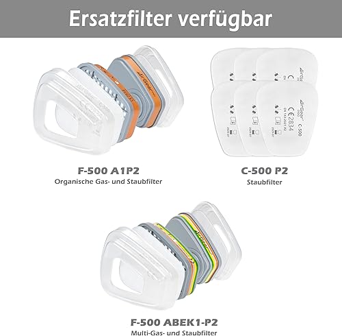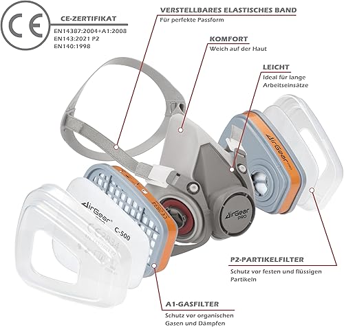 AirGearPro M-500 Atemschutzmaske mit Filter, Gasmaske Staubfilter für Lackieren, Arbeiten, Schleifen, Feinstaub (M-500 A1P2)