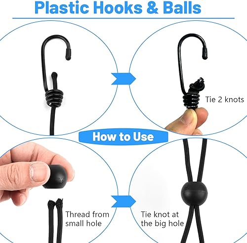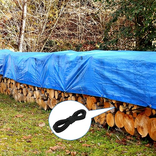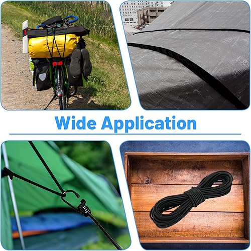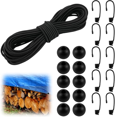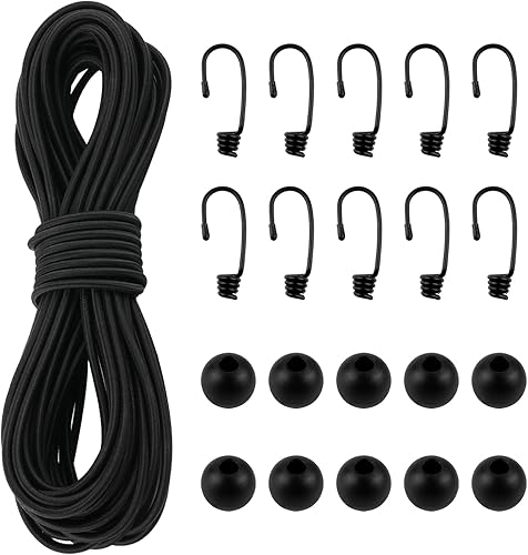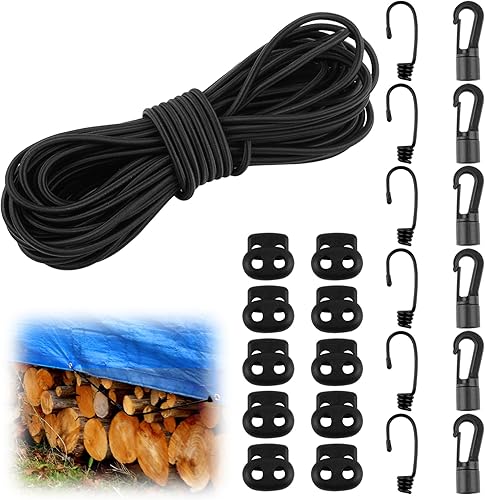 Gummiseil 5 mm x 15 m, Elastisches Expanderseil, Gummischnur mit Spiralhaken, Kunststoffhaken und Kordelstopper, Gummikordel Schwarz, Spannseil Planenseil für Anhängerplane, Sonnensegel, Zelte