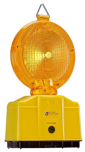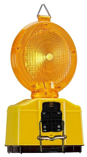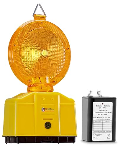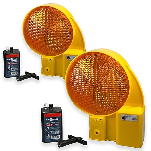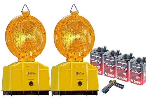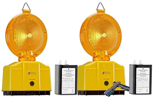 UvV Baustellenleuchten 2 Stück LED Warnleuchte Gelb mit Dämmerungsfunktion, Automatische Tag- und Nachtschaltung, inkl. Batterien und Lampenschlüssel