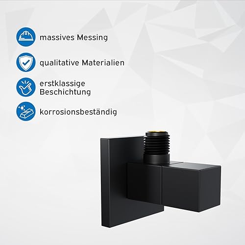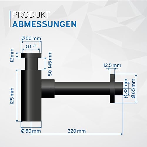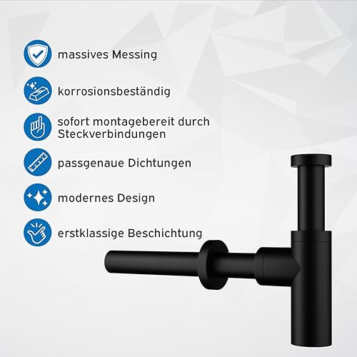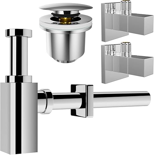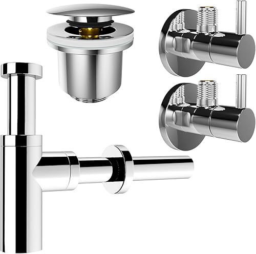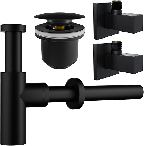 kör4u Design Set Siphon 1 1/4 Zoll x 32 mm, Pop-Up Ventil und 2x Eckventil, Ablaufventil mit Dichtungen, für Waschbecken (schwarz)