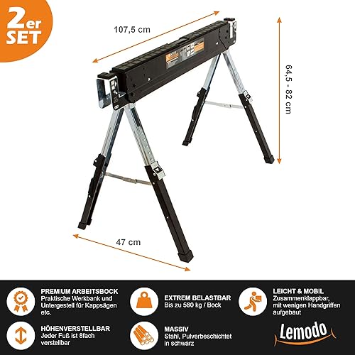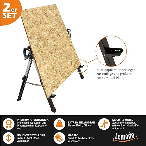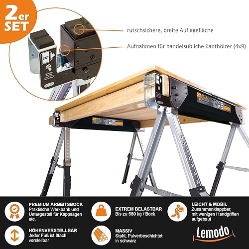 LEMODO Premium Arbeitsbock höhenverstellbar | Klappbock 2er Set | Montagebock mit 580 kg Tragkraft | Unterstellbock mit praktischem Tragegriff und ausklappbaren Halterungen zur Holzbearbeitung, Holz