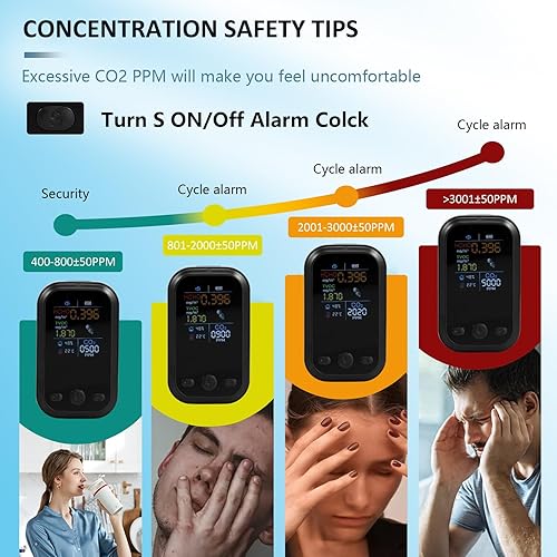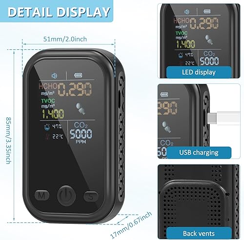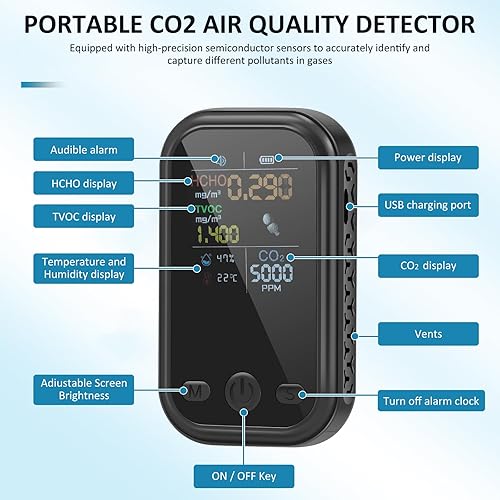 CO2 Messgerät Raumluft Luftqualitätsmessgerät zur Messung HCHO, TVOC, CO2, Temperatur Air Quality Monitor mit Alarmen Kohlendioxid Messgerät für Inneneinrichtung Lager Büro (Schwarz)