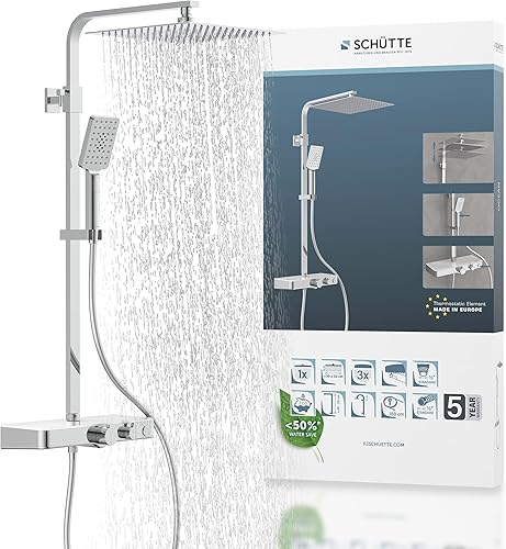 Schütte OCEAN Duschsystem mit Thermostat und Glasablage-Duschset mit 30x30cm, Regendusche mit Wandhalterung und Duschkopf-Duschpaneel Duschsäule in Chrom/Anthrazit 60531