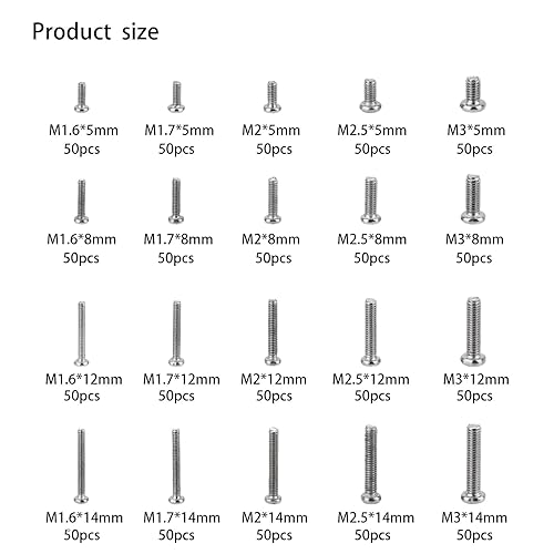 woshilaoDS 1000 Stk Kleine Schrauben Set, Mini Schrauben Set, M1.6 M1.7 M2 M2.5 M3 Mikro Schrauben Sortiment Kit, Rundkopfschrauben Kreuzkopfschrauben für Brillen Uhren Laptops Computer