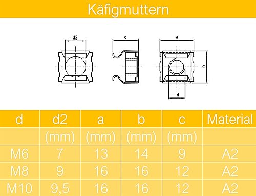 Techtanium® Käfigmuttern [für Blechstärken 1,7 mm bis 2,7 mm] M6 aus Edelstahl A2 (10 Stück) | Kastenmuttern | Einsteckmuttern | Blechmuttern