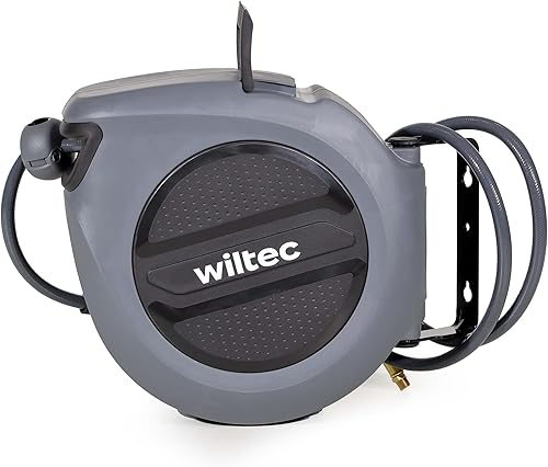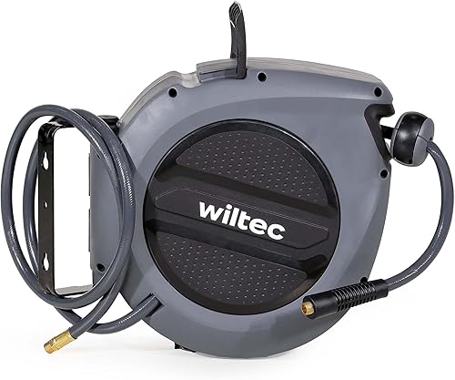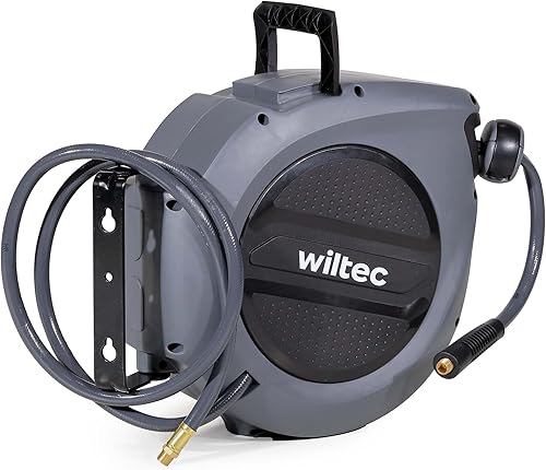Wiltec Druckluft Schlauchtrommel 15 m, automatische Druckluftschlauchtrommel Stahl, 17 bar Drucklufttrommel, Schlauchaufroller mit 180° Halterung