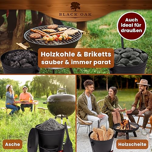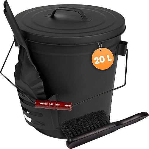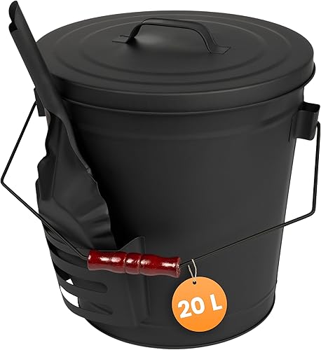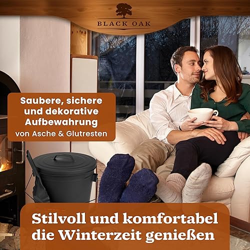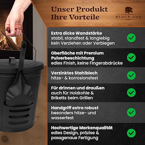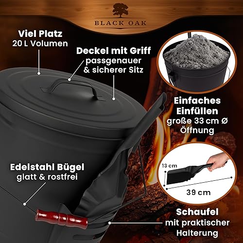 BLACK OAK Ascheeimer Stromboli 20L – schwarz mit Deckel & Schaufel - groß 20 Liter - Stahl feuerfest verzinkt & pulverbeschichtet Asche & Kohle Eimer ideales Zubehör für Kamin Kachelofen Holzofen