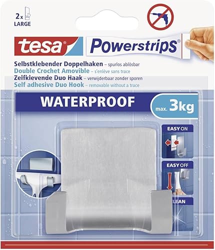 tesa Powerstrips Doppelhaken Waterproof Zoom - selbstklebender Haken für Dusche und Bad, groß - Metall-Badhaken - belastbar bis 3 kg
