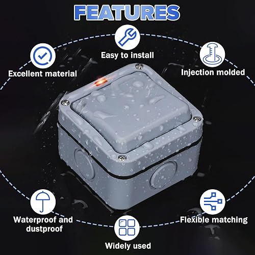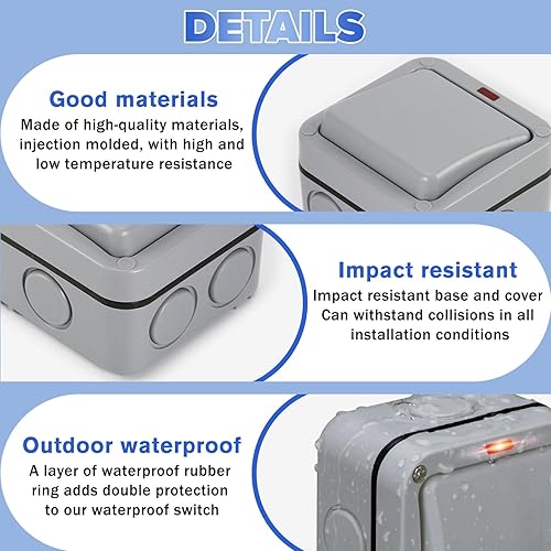 Idota Lichtschalter Außen Wetterfester Schalter Universalschalter, 20A IP66 Wasserdichter Schalter mit Staub Unabhängigem Schalter Und Kontrollleuchte Lichtschalter Aufputz für Outdoor Garten Balkon