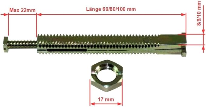 SN-TEC Wechselstift, Patentstift, Vierkantstift für einseitige Befestigung, Länge 60, 80 oder 100mm, Stärke: 8, 9 oder 10mm (10 mm Vierkant, Länge: 100mm)