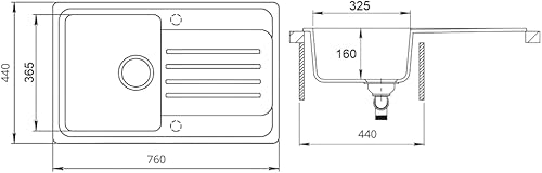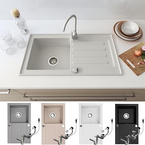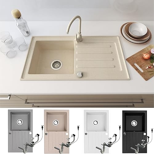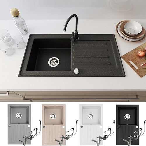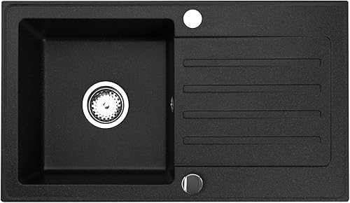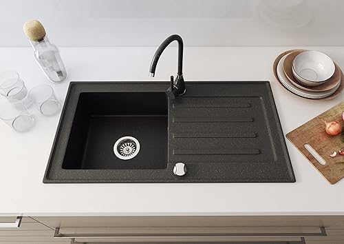 Faizee Möbel | Spülbecken Granit Schwarz 75x44 cm | Hochwertige Küchenspüle & Einbauspüle | Eckiges Spülbecken | Beidseitig montierbare Granitspüle | Einbaugranitspüle ab 45 cm | Inkl. Siphon-Set