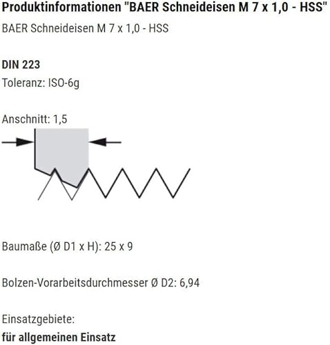 BAER Gewindeschneider M7 HSS Schneideisen - M 7 x 1,0 - Gewindeschneideisen metrisch Regelgewinde - Außengewinde Schneider aus hochlegiertem Werkzeugstahl, metrisches Außengewindeschneideisen