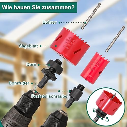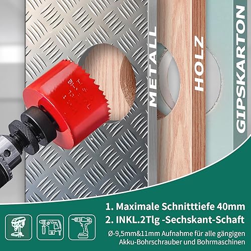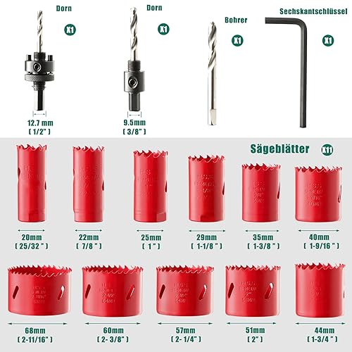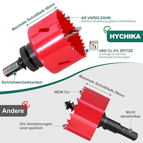 HYCHIKA Bimetall Lochsäge Set, 17tlg Lochbohrer Ø20mm-68mm, Maximale Schnitttiefe 40mm, Ideal zum Bohren von Weichmetall, Holz, PVC Platte und Kunststoffplatte