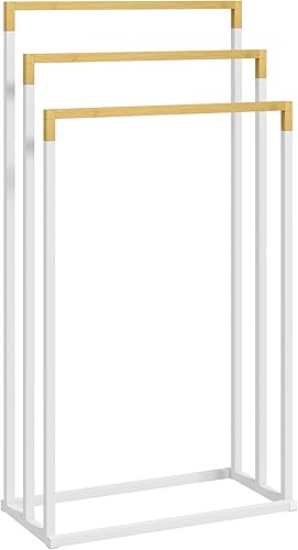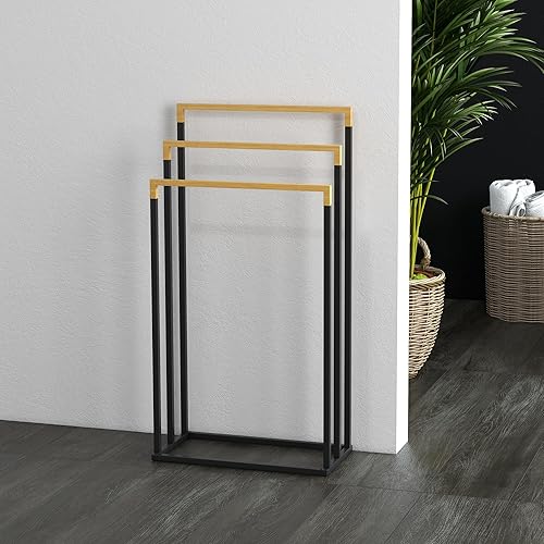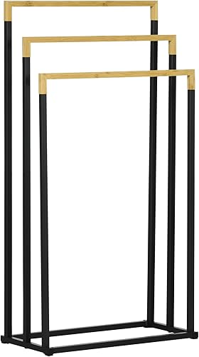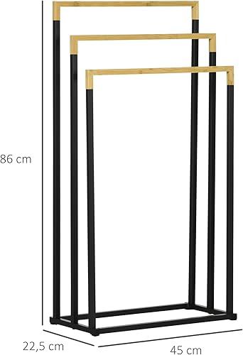 kleankin Handtuchhalter Freistehend, Handtuchständer mit 3 Handtuchstangen Badetuchhalter für Badezimmer Stahl Bambus Schwarz