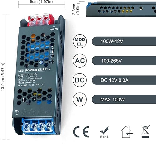 KSIBNW 12V LED Trafo 100W, 230V auf 12V Transformator 12V 8,3A LED Extra Dünn Treiber Netzteil Adapter LED Schalt Niedervolttrafo, AC 230Volt to DC 12Volt 8,3A 100W Konstantspannungs Netzteil